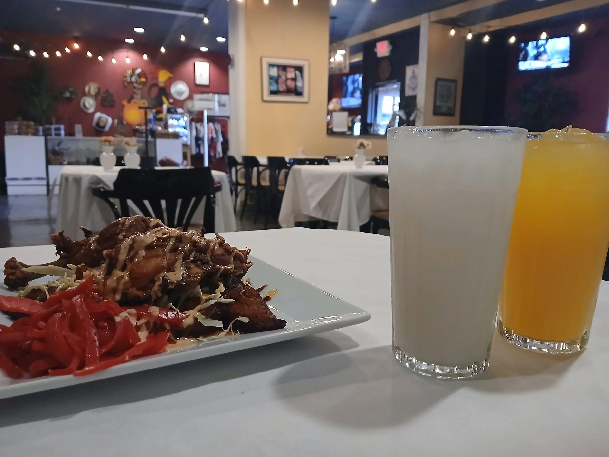Pollo Mesapa, un platillo con pollo frito, platanos dulces, cebollas rosadas, chirmol, salsa de tomate y aderezo, es uno de muchos platos servido en Honduras’ Kitchen. Unas de las bebidas hondureñas incluyen una bebida blanca de guanábana y una bebida amarillo-naranja de maracuyá. Foto por Argentina Talley