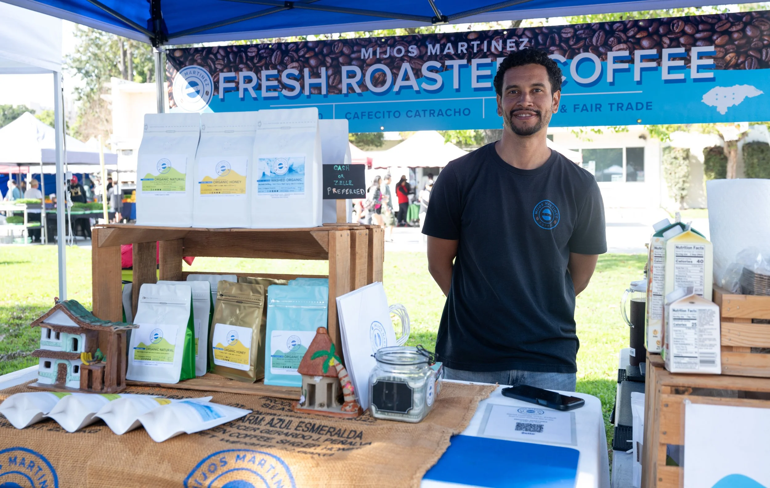 His stand offers hot and cold options for customers to try out, including specialty drinks like Brown Sugar Banana and Coconut Cold Brew. Customers can also take bags of Hondruan coffee beans home or order them online at mijosmartinez.com.