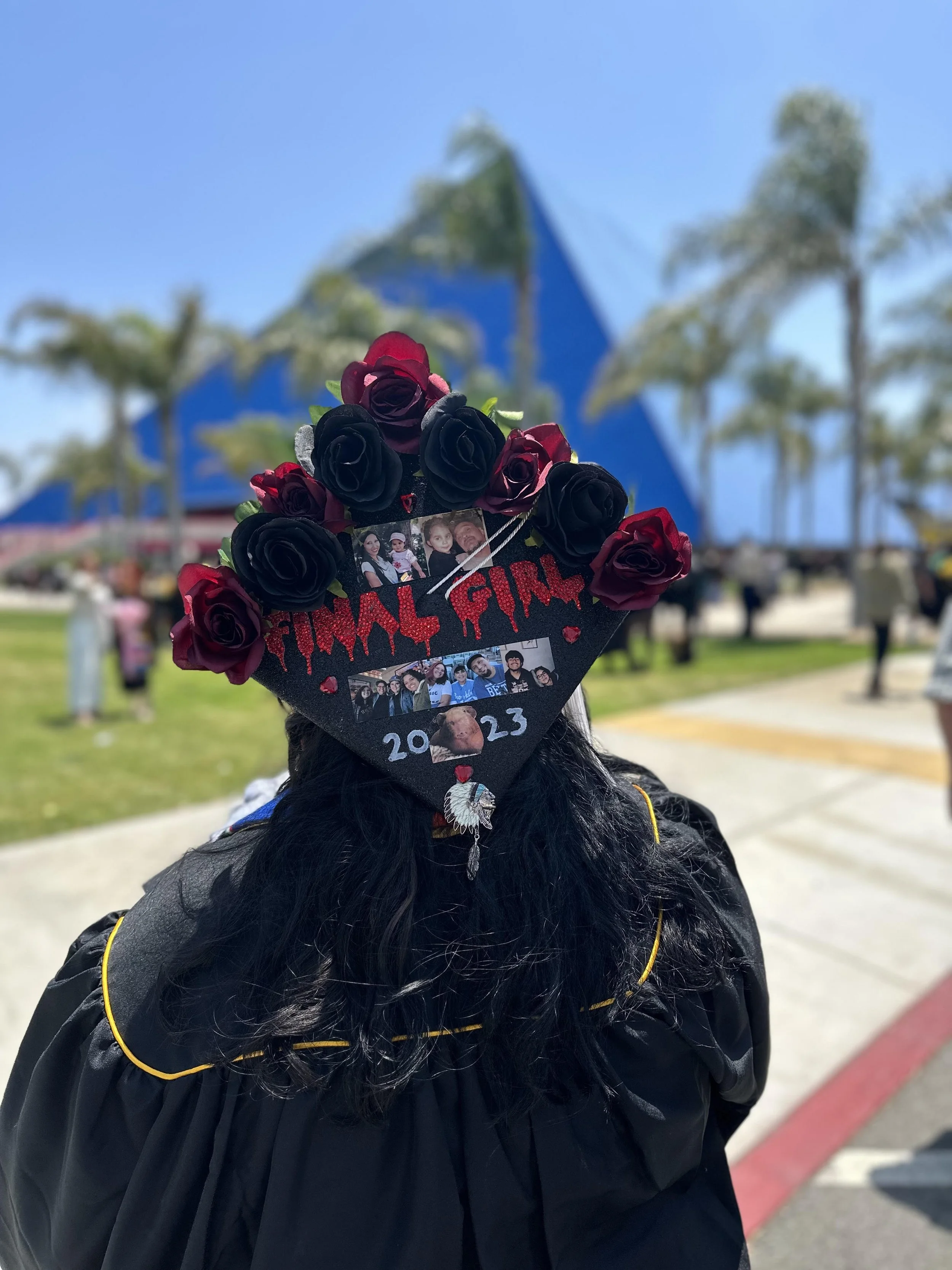 Cassidy Reyna’s graduation cap saying “Final Girl” (in reference to the horror movie character trope) with pictures of her loved ones. Photo Credits: Cassidy Reyna